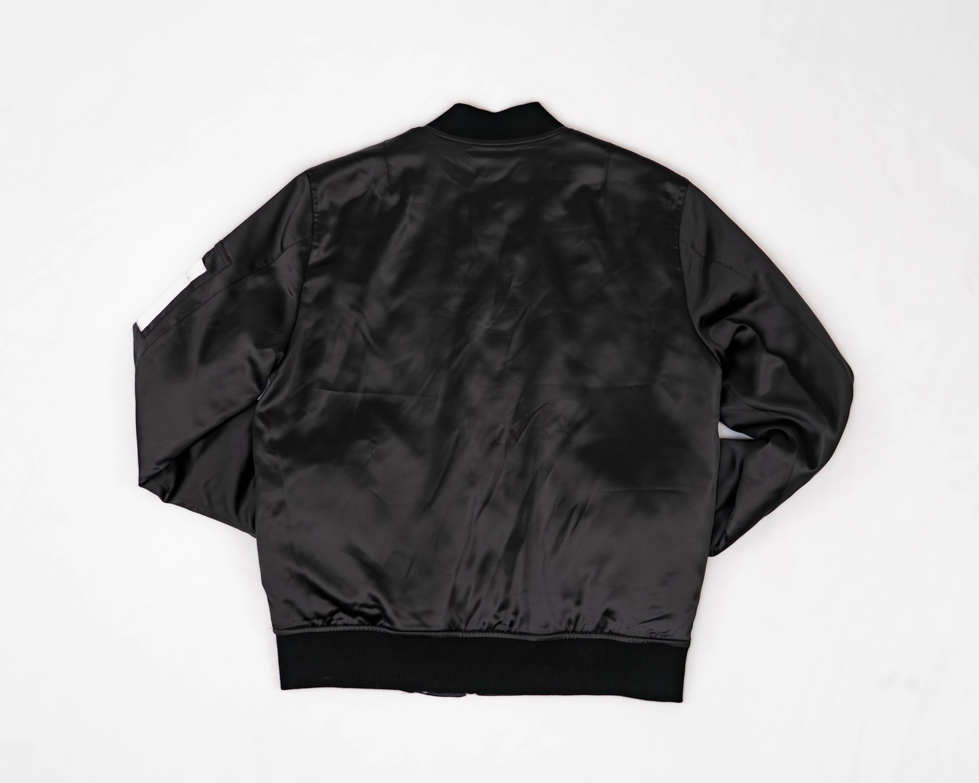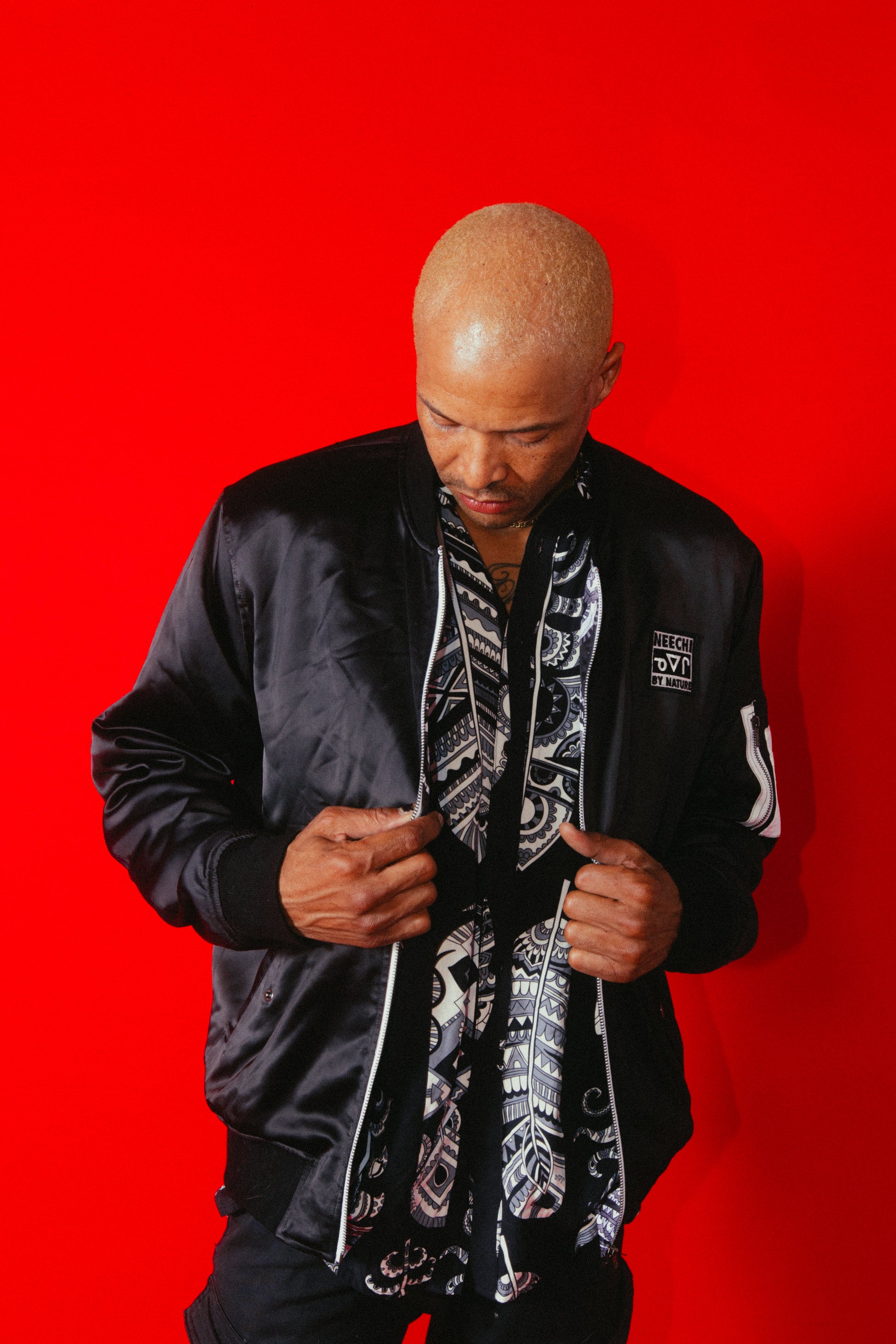 Reversible satin bomber jacket featuring the Neechi Feather print in white, black, and grey.